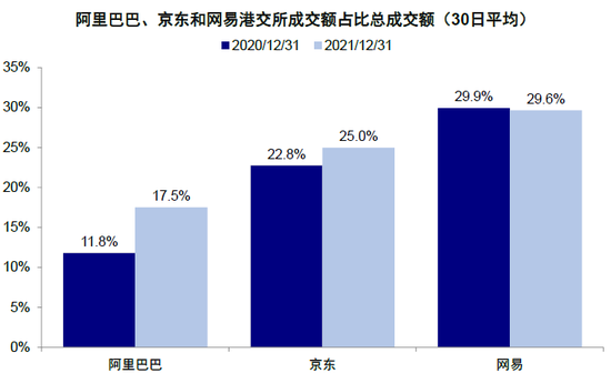 圖表22:阿里巴巴與京東在港交所的成交額佔比過去1年均有所上升,但網易則基本維持不變