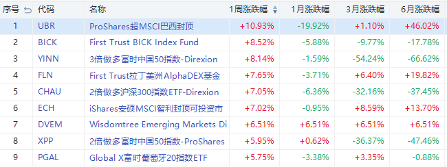 A股挺起脊樑!新興市場本周逆勢上揚,做多巴西、中國、智利的ETF紛紛漲超5%,2倍做多滬深300指數的CHAU更是漲超7%。