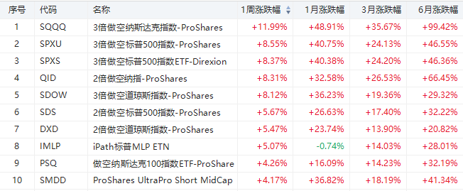 美股股指ETF中,做空三大股指的ETF本周漲幅霸榜,先空納指再空標普500,賺多少似乎只取決於槓桿高低。其中3倍做空納指的SQQQ本周再漲12%,半年已接近翻倍。