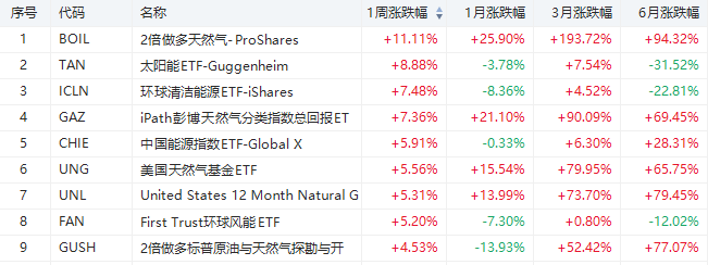 能源ETF方面,本周2倍做多天然氣的BOIL漲幅最高,全周累計上漲11.11%,近半年已接近翻倍!緊隨其后,太陽能ETF迎來久違大漲,本周漲近9%。