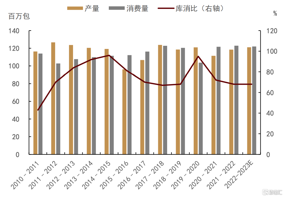► 出口限制政策或將落地,國際棉花供給可能收縮。當前,印度國內棉花價格高企,為平抑棉價上漲,4月13日印度財政部宣佈,4月14日起至9月30日對棉花進口實行關税豁免。然而,截至5月13日,Shankar-6現貨價格環比上漲10.47%至178.25美分/磅,可見進口税豁免政策對於平抑棉價效果有限。而在當下新季棉花播種受阻的情況下,印度棉花價格保持持續上漲態勢。因此,印度政府表示不排除發佈禁止棉花出口的限令,直至9月30日解除。根據USDA預測,2022/23年度印度棉花出口預計值為400萬包,佔全球出口的8.41%。我們認為,在當前美棉產區乾旱的情況下,印度棉出口是影響全球棉花供給的重要因素。雖然2022/23年度印度棉產量預計較去年有所修復,但若印度棉花限制出口政策落地導致出口量收縮明顯,可能進一步加劇全球棉花緊張態勢,國際棉價或在利好消息的影響下再度衝高。