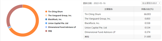 目前港股49億股,其中個人佔比66.003%,傳統投資經理佔比2.285%,政府養老金佔比0.24%,其他佔比31.472%。主要股東Tin Ching Shum、The Vanguard Group, Inc.、BlackRock, Inc.、Union Capital Pte. Ltd、Dimensional Fund Advisors LP、其他分別佔比66.003%、0.85%、0.558%、0.534%、0.374%、31.98%。