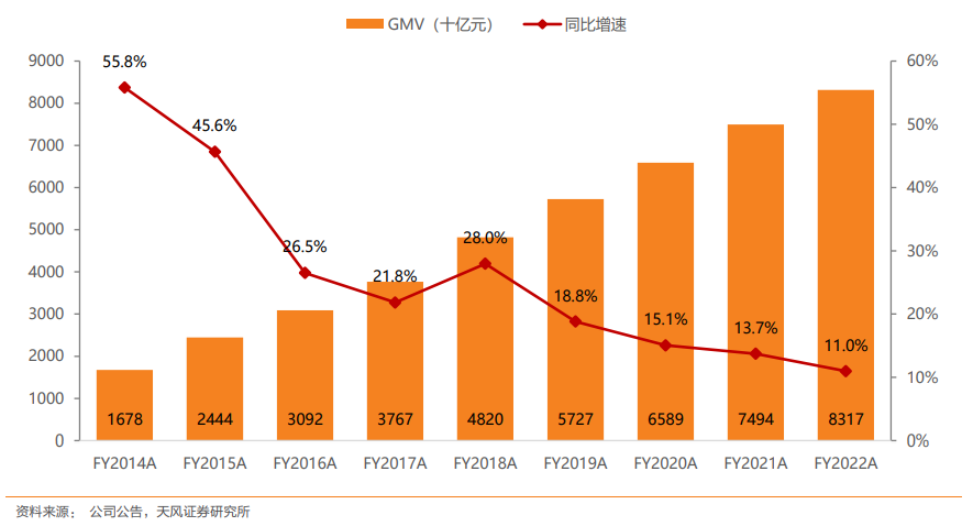 GMV:FY2022全年GMV為RMB8.317萬億元,同比增長10.98%。