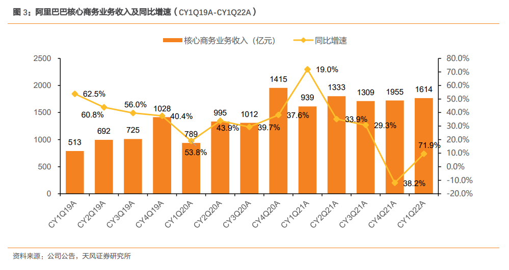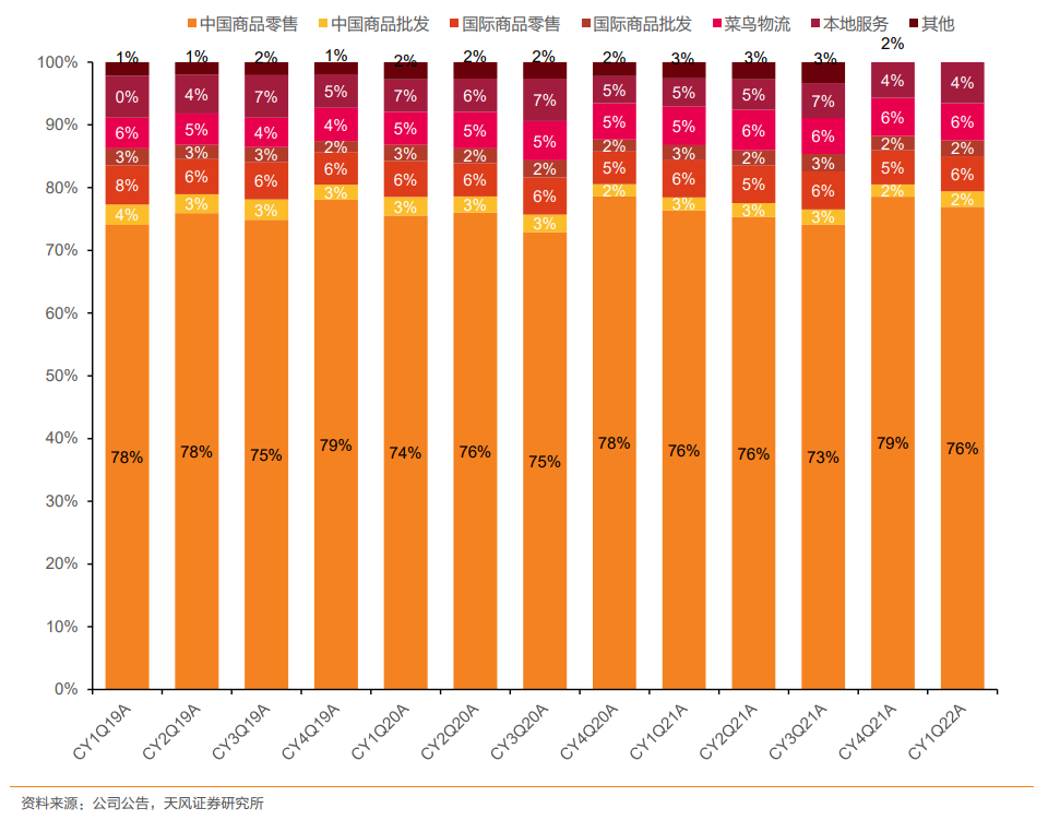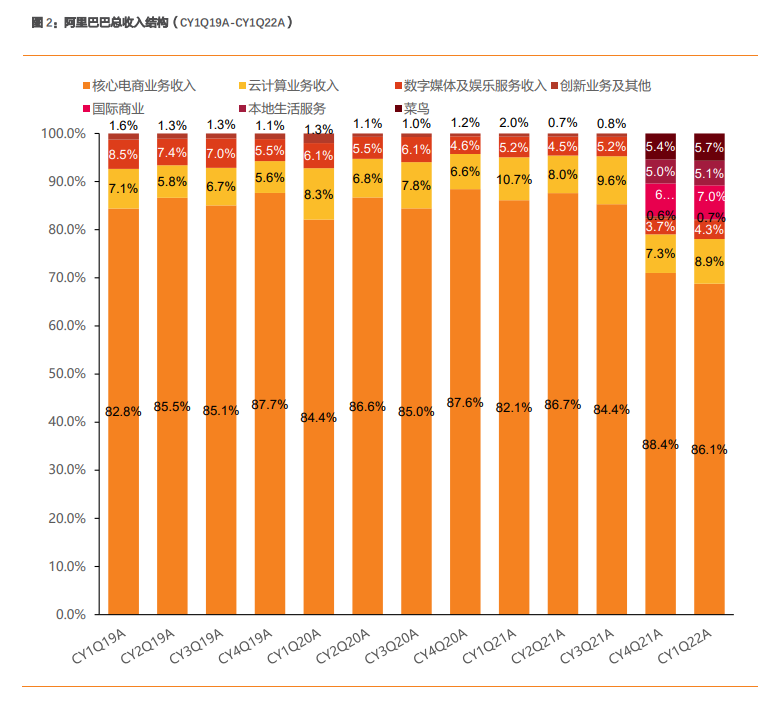 菜鳥(17年10月中旬起並表):本季度收入為RMB115.82億元,同比增長16%,佔總收入的6%;主要原因是為提升消費者體驗升級的消費者物流服務的收入增加。部分收入被國際訂單量受俄羅斯和烏克蘭衝突導致供應鏈和物流中斷的影響而減少所划算消,划算銷跨分部影響前本季度收入為RMB164.51億元,同比增長19%,主要來自外部收入增長以及向中國零售商業業務(如天貓,淘寶和淘特)提供的物流履約解決方案和增值服務的增長。