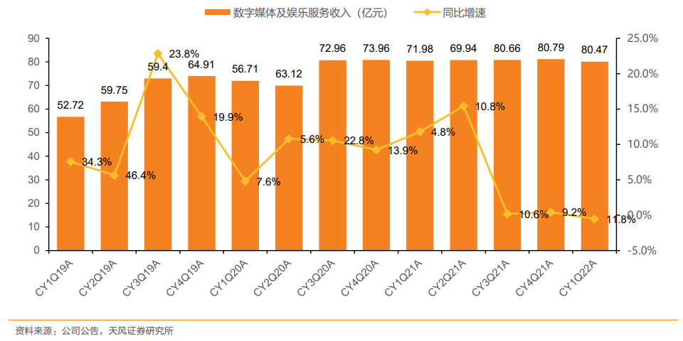 【3.數字媒體及娛樂】本季度收入為RMB80.05億元,同比下降1%,佔總收入的4%。