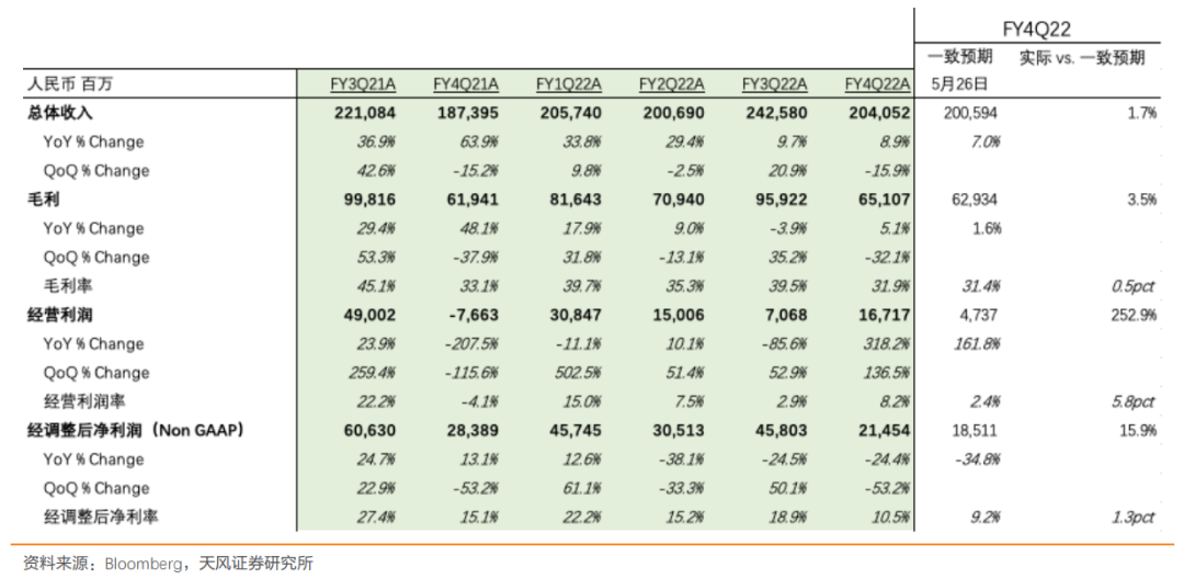 經調整歸屬股東淨利潤(Non-GAAP):本季度經調整歸屬股東淨利潤為RMB214.54億元,同比下降24.4%,環比下降53.2%,高於彭博一致預期15.9%;經調整歸屬股東淨利率為10.5%,比去年同期下滑4.6個百分點,比上一季度下滑8.4個百分點;FY2022全年Non-GAAP歸屬股東淨利潤達1435.15億元,同比下降19.8%,淨利率16%,較去年下降8.9個百分點。