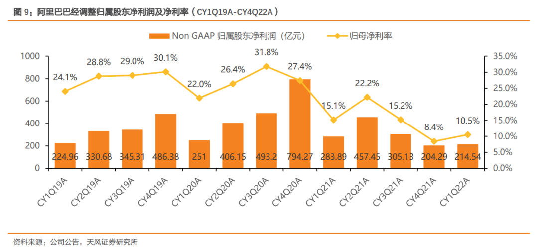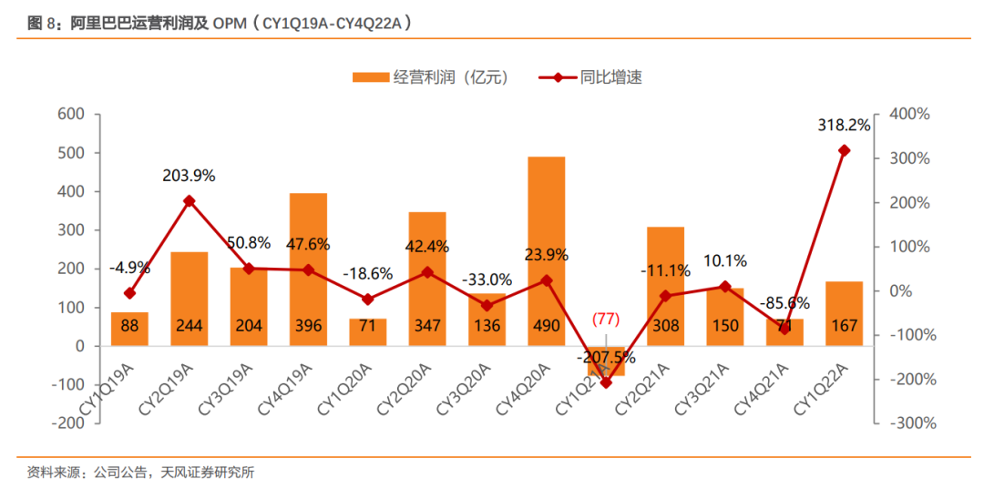 總收入:FY22Q4(對應CY22Q1)總收入是RMB2,040.5億元,同比增長8.9%,高於彭博一致預期1.7%;增長主要來自國內商業業務、雲業務服務和本地生活服務及國際商業業務。