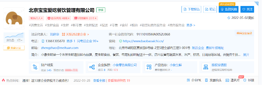 象優選和象大廚隸屬於原小象生鮮品牌。象大廚和象優選的品牌運營公司是北京寶寶愛吃餐飲管理有限公司(下稱寶寶愛吃),后者也正是小象生鮮和美團買菜的運營主體。