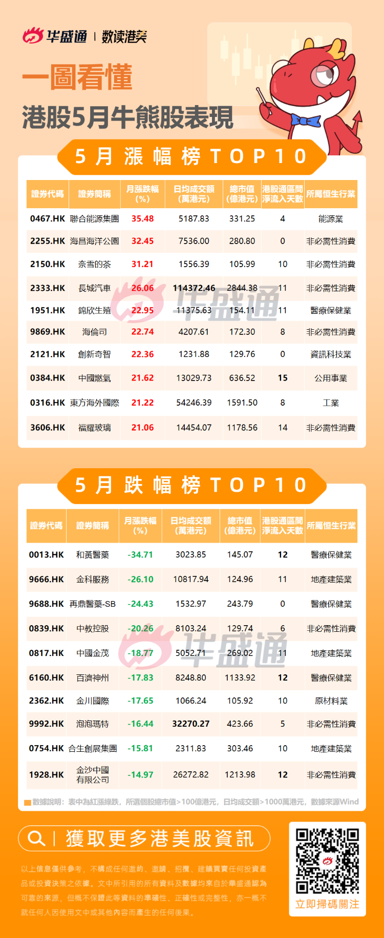 本月個股漲幅TOP10中,能源股聯合能源集團月升35.48%位居第一,公司獲納入MSCI香港小型指數,將於5月31日收盤后生效;東方海外國際「染藍」利好持續,月內獲港股通淨流入8天,股價破頂升21.22%;汽車股長城汽車、吉利汽車、比亞迪股份5月均有不錯表現,漲幅分別為26.06%、20.58%、18.74%。