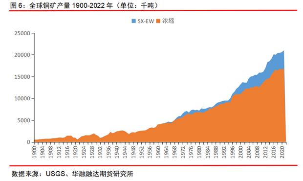圖6展示了1900-2021年全球銅礦開採趨勢。我們可以看到,自1900年世界銅產量不足50萬噸以來,世界銅礦產量以每年3.2%的速度增長到2021年為2100萬噸。我們還目睹了20世紀70年代出現的一種新的銅生產技術,包括銅的提取和堆浸,礦物以電解液的形式輸送(被稱作溶劑提取和電積,或SX-EW法)。