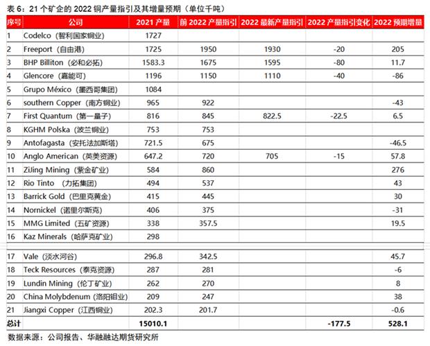 另外進入名單的中國的企業有紫金礦業、五礦資源、洛陽鉬業、江西銅業,2021年銅精礦產量分別為584千噸、338千噸、209千噸和202千噸。