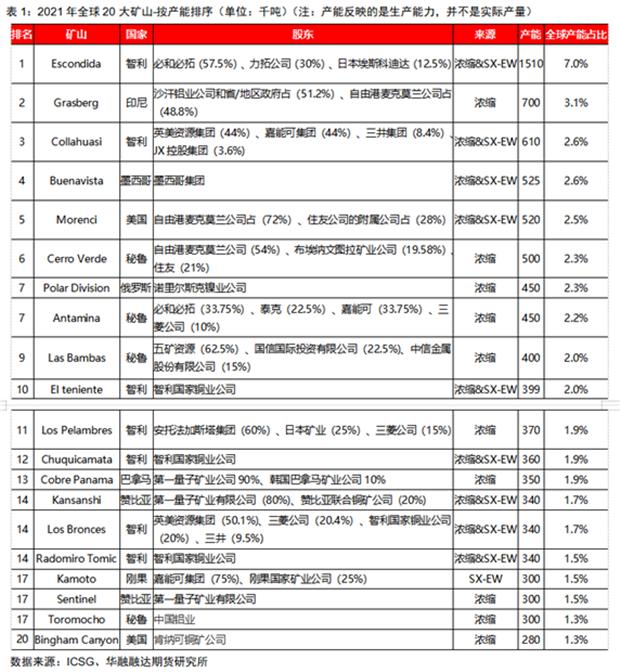 根據ICSG2021年的數據顯示,位於智利的Escondida銅礦是一個露天礦也是全球產能最大的銅礦,全球產能佔比7%。位列產能第二名Grasberg位於印度尼西亞最高的爪哇山附近,是世界上黃金儲量最大、銅儲量第二大的銅金礦。它由四個地下礦山和一個露天礦山組成。Collahuasi礦位於智利北部Tarapacá地區的高海拔地區。該露天礦最初於1880年開礦,但由於地緣政治原因,從1930年到1978年停產,直到新礦的發現促使生產重新開始。
