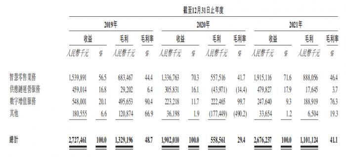 友寶四大業務板塊中,智慧零售業務為第一大業務,2019-2021年,該服務收入分別佔公司總收益的56.5%、70.3%及71.6%。