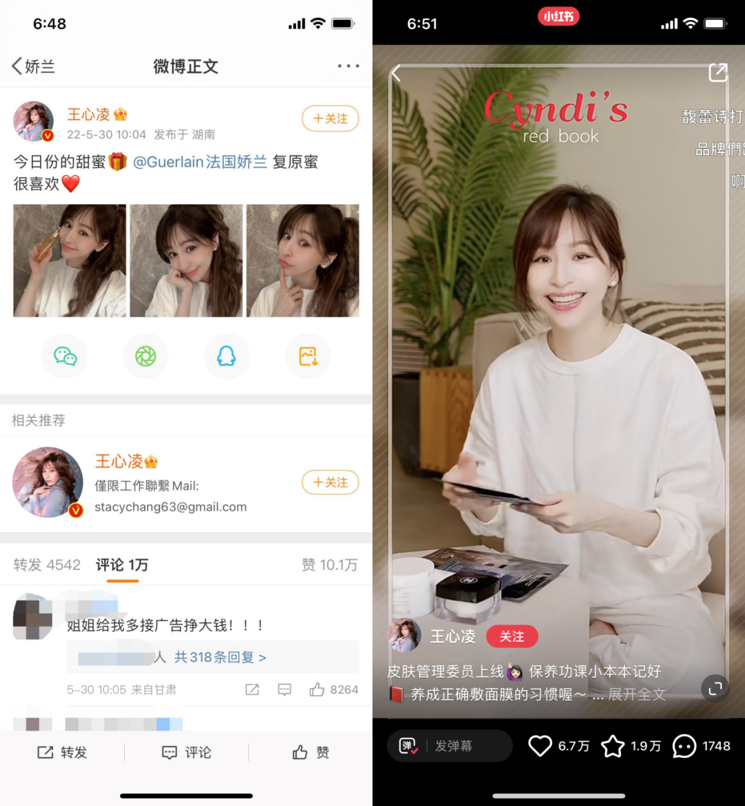 目前,王心凌已在微博、小紅書上推廣或推薦了法國嬌蘭復原蜜、理膚泉B5面膜、fresh玫瑰保濕面膜、DMS維他命面膜、CHANEL保濕面膜等產品。