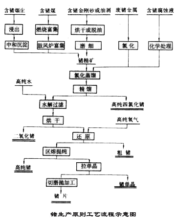中國最早提煉鍺就是從菸灰里。在煤中含有鍺,煤在燃燒時大部分鍺的化合物受熱蒸發,與菸灰一起出來,進到煙道后,温度降低,便冷凝在煙道灰中。據測定,煙道灰中含鍺量可達0.1%,有的甚至高達2%,比煤中含鍺量高100~2000倍。從煙道灰或礦物中提取的鍺,通常是氧化鍺或硫化鍺。用氫、碳或鎂還原,可得到鍺的金屬粉末,再用1000℃的高温加熱,才能熔鑄成金屬鍺錠。用於製造半導體的鍺必須非常純淨,通常採用「區域熔鍊」冶金法來提取。