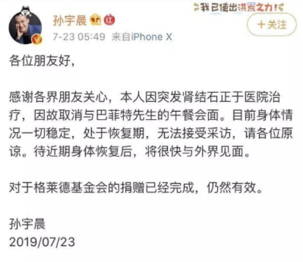 在約定日期的前兩天,孫宇晨突然在社交媒體上發文,表示自己因為腎結石,取消了和巴菲特的午餐。至於之前約定好的錢,也不會取回,繼續捐給基金會。