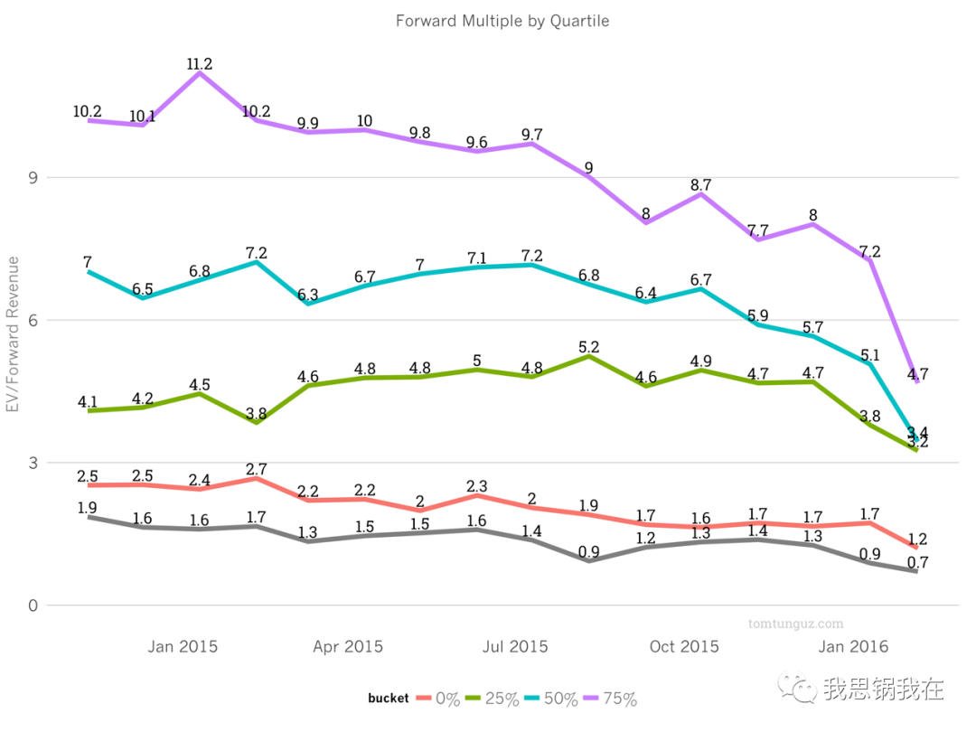 下圖來自Redpoint企服領域投資人Tomasz Tunguz在2016年的博客,顏色代表不同營收增速區間,縱軸代表遠期PS(當前市值/未來十二個月營收)。如果你是一家營收1億美金且發展速度超過75%的SaaS公司,2016年1月市值只有不到5億美金。