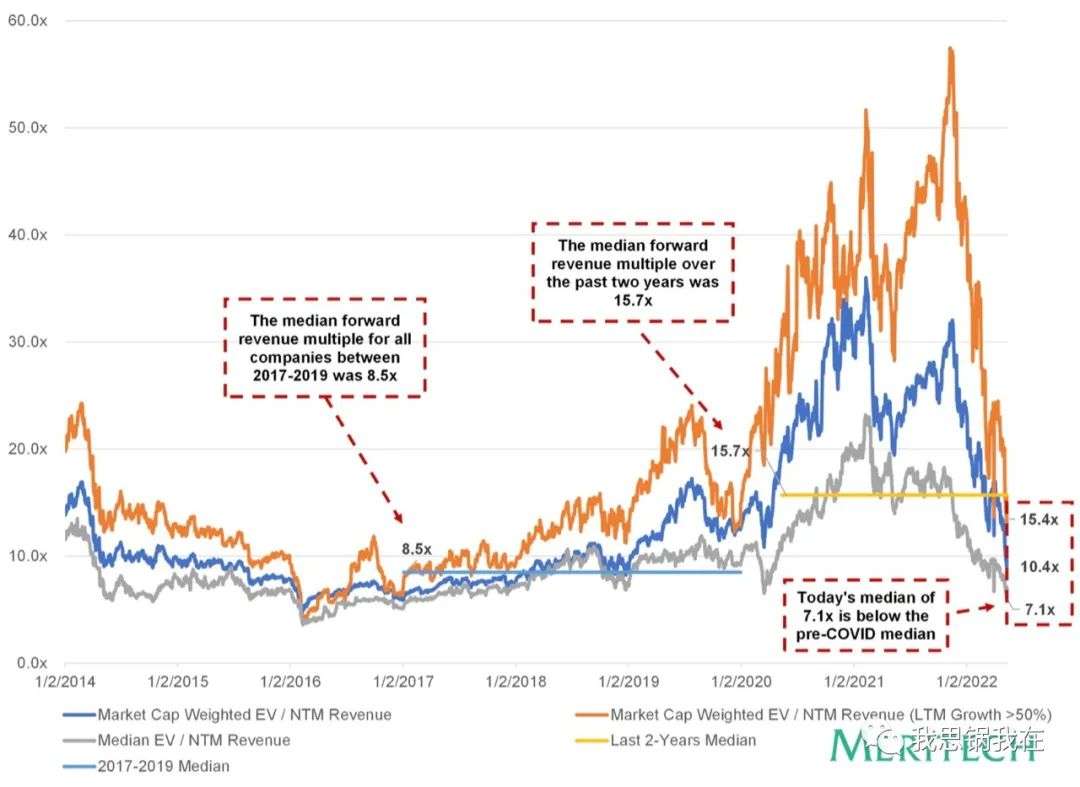 之所以説異曲同工,還要結合Meritech報告里的一張圖,在這九十多家上市公司里,遠期PS的中位數在疫情期間最高接近25倍,而現在只有7倍。這個數字比2017年到2019年的8.5倍平均數還低。同樣,營收增速越高的公司受到衝擊越大,年增速超過50%的公司PS從最高點57倍自由落體,至現在的15倍,跌幅達70%,而2016年對在相同增速區間的公司來説跌幅只有約50%。另外宏觀環境和加息等因素,讓市場有理由認為下跌仍會持續。