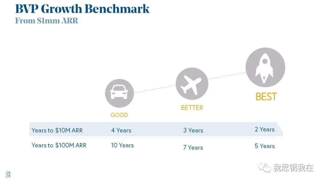 首先針對ARR增長,BVP提出了判斷發展快慢的標準。兩年內ARR達到1,000萬美金以及五年內達到1億美金的公司位於最優秀區間。