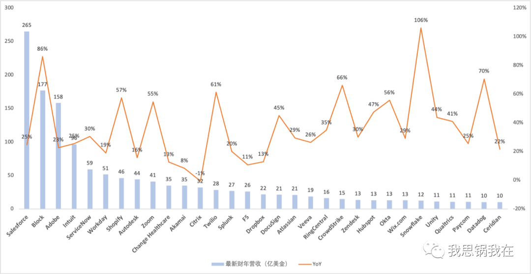 在統計到的三十一家公司里,營收中位數為22億美金,年同比增速29%。我們既見證了Salesforce穩步邁向300億美金的關卡仍保持25%的增速,也看到Snowflake首次突破10億美金后仍保持同比106%的驚人速度。