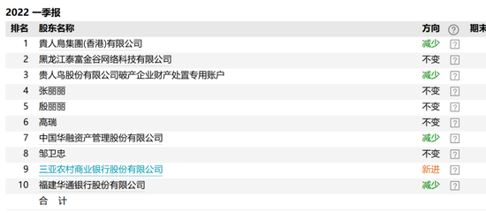 2022年一季報顯示,貴人鳥前三大股東分別持股26.18%、20.36%、4.72%。