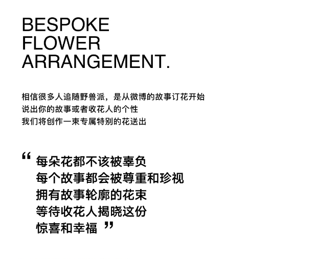野獸派誕生於微博,最初沒有花店也沒有官網,客户買花只能私信相海齊,講述自己的故事,相海齊再根據這些故事搭配花束,並把故事以匿名的方式在微博上分享出來。