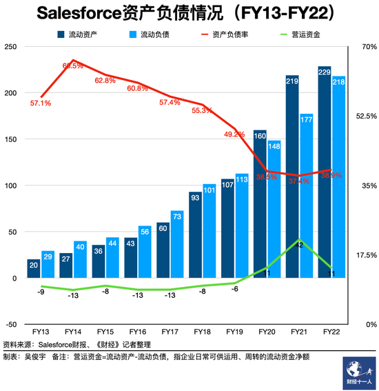 為收購Slack,Salesforce不僅消耗了近100億美元的現金流,還發行了80億美元的40年債券,並向花旗銀行、摩根大通等機構借貸了100 億美元。Salesforce目前資產負債率僅為38.9%,和歷史相比仍處於低點。但Salesforce流動負債也來到歷史最高點218億美元。流動負債規模僅次於Oracle的242億美元,遠高於Adobe的69億美元。