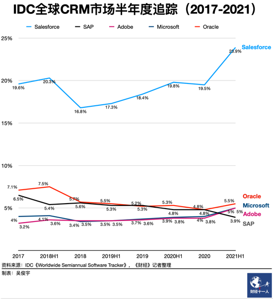 頻繁收購和高速增長讓Salesforce逐步成為巨頭。2012年Salesforce在CRM市場份額超過Oracle。2021年在全球CRM市場位居第一且佔據了23.9%的份額。2020年市值超過Oracle。