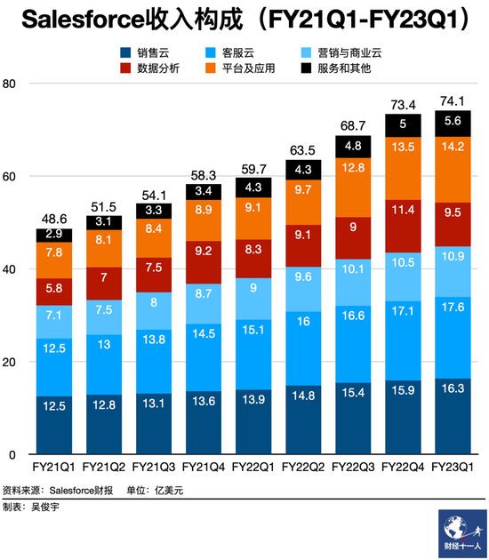 Salesforce的戰略也體現在各業務板塊業績增長上。Salesforce財報中把營收分成了六部分,分別是銷售雲、客服雲、營銷與商業雲、數據分析、平臺及應用,服務和其他。前五項被統稱為「認購和支持」,是典型的軟件訂閲業務,在2022財年中佔總收入的93%。服務和其他指客户專業服務,佔總收入的7%。