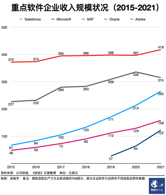 這個生態向橫向拓展,是CRM(客户關係管理)、ERP(企業資源管理)、SCM(供應鏈管理)、HCM(人力資源管理)等一系列企業軟件。向下拓展,是數據庫、雲基礎設施等底層技術服務。早期其他軟件廠商、基礎設施服務商轉型步伐相對較慢,Salesforce優勢明顯,想象空間巨大。隨着橫向、縱向產業雲化進程也進入了成熟期,微軟、Oracle等企業依靠體量優勢正在試圖重新拿回主導權。