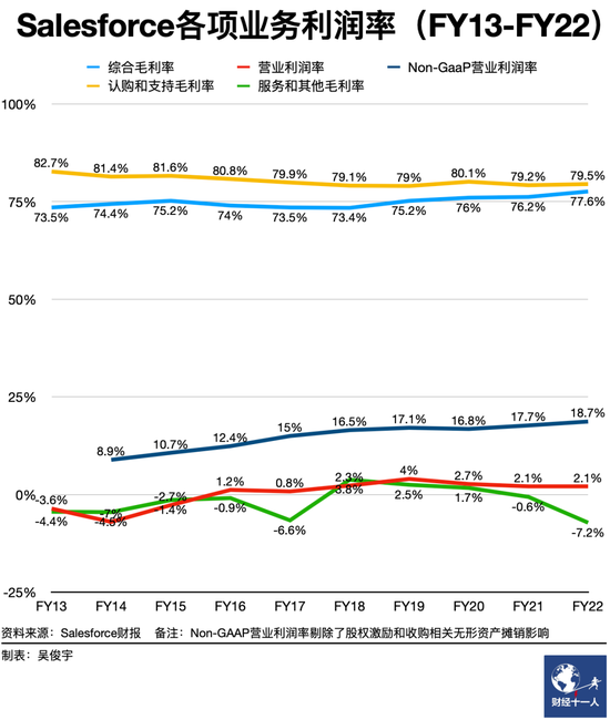 Saleforce利潤率、續費率兩大關鍵指標仍在持續增長。Salesforce雖然服務成本在不斷提升,但在非美國會計通用準則下(美國通用會計準則中營業利潤需要計入無形資產與投資減值。Salesforce的統計口徑剔除了股權激勵和外部收購攤銷的影響)Salesforce利潤率仍在持續攀升,2022財年已經達到了18.7%。