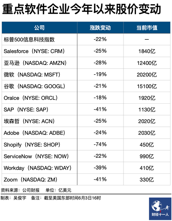 事實上,Salesforce股價下滑受美國宏觀環境影響。2020年疫情后,美國SaaS企業股價飆升,但「后疫情」各公司股價均在調整。今年標準普爾500信息科技指數(包含亞馬遜、微軟等標普500指數的信息技術行業成分股)整體下跌20%。生態型巨頭亞馬遜下跌28%,微軟下跌19%。平臺型SaaS企業Salesforce下跌25%,Oracle下跌18%,SAP下跌41%。垂直型SaaS企業Shopify下跌74%,Zoom下跌41%。