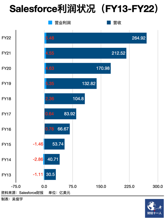 營收增速快,但Salesforce的營業利潤率卻一直保持着較低的水平,幾乎從未超過3%。2004年上市至2015財年,Salesforce長期保持營業利潤低於1億美元的狀態,虧損是常態。即使2016財年規模化盈利后,Salesforce的營業利潤仍長期徘徊在5億美元左右。這也受到了海外媒體長期詬病,Salesforce被稱為一個「沒有利潤的公司」。