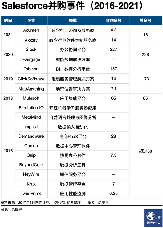 2016年Salesforce以50億美元收購了超過10家企業,甚至一度試圖收購領英和Twitter。2018年以65億美元收購了應用集成平臺Mulessoft,2019年以173億美元收購了數據分析平臺Tableau等三家公司。2020年以228億美元收購了協同辦公平臺Slack。2021年收購步伐雖有放緩,仍然以18億美元收購了兩家大型政企的服務商。