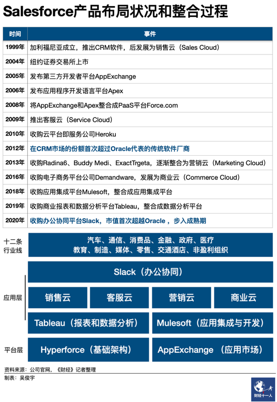 從成立之初至今,Salesforce的諸多動作和上述戰略幾乎是一以貫之的。依靠十余年來的持續擴張和併購,Salesforce構建起了完整的SaaS/PaaS生態。《財經十一人》統計發現,從2010年開始,Salesforce幾乎每年都會收購數家企業,前期投資支出規模不大,2016年之后,Salesforce對外收購步伐加速。