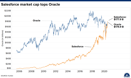 2004年上市后,Salesforce連續17年保持着20%-60%的營收增速,和亞馬遜AWS共同帶動了全球軟件產業雲轉型。2020年7月,Salesforce市值超越Oracle。目前是微軟在SaaS/PaaS賽道的最大競爭對手。