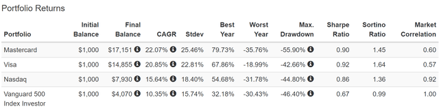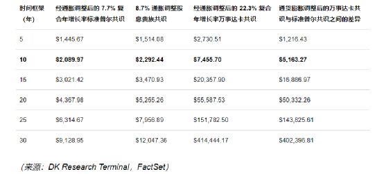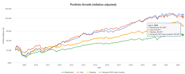 MA 和 V 的通脹調整后回報是納斯達克指數的 2 倍至 2.5 倍,實際回報率是標準普爾 500 指數的 3 倍至 4 倍。