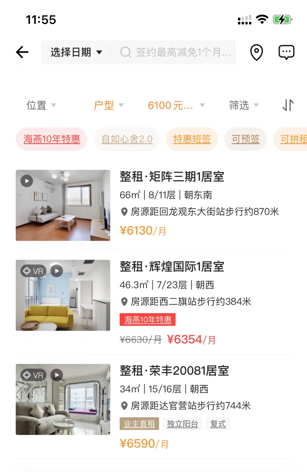 不同區域的房源價格差距很大,同樣6000元每月的租金,可以在北京4環外租一套一居室。在自如APP搜索6000元以上的房源,在回龍觀、西二旗、達官營都有可以租到30—60平米左右的一居室。