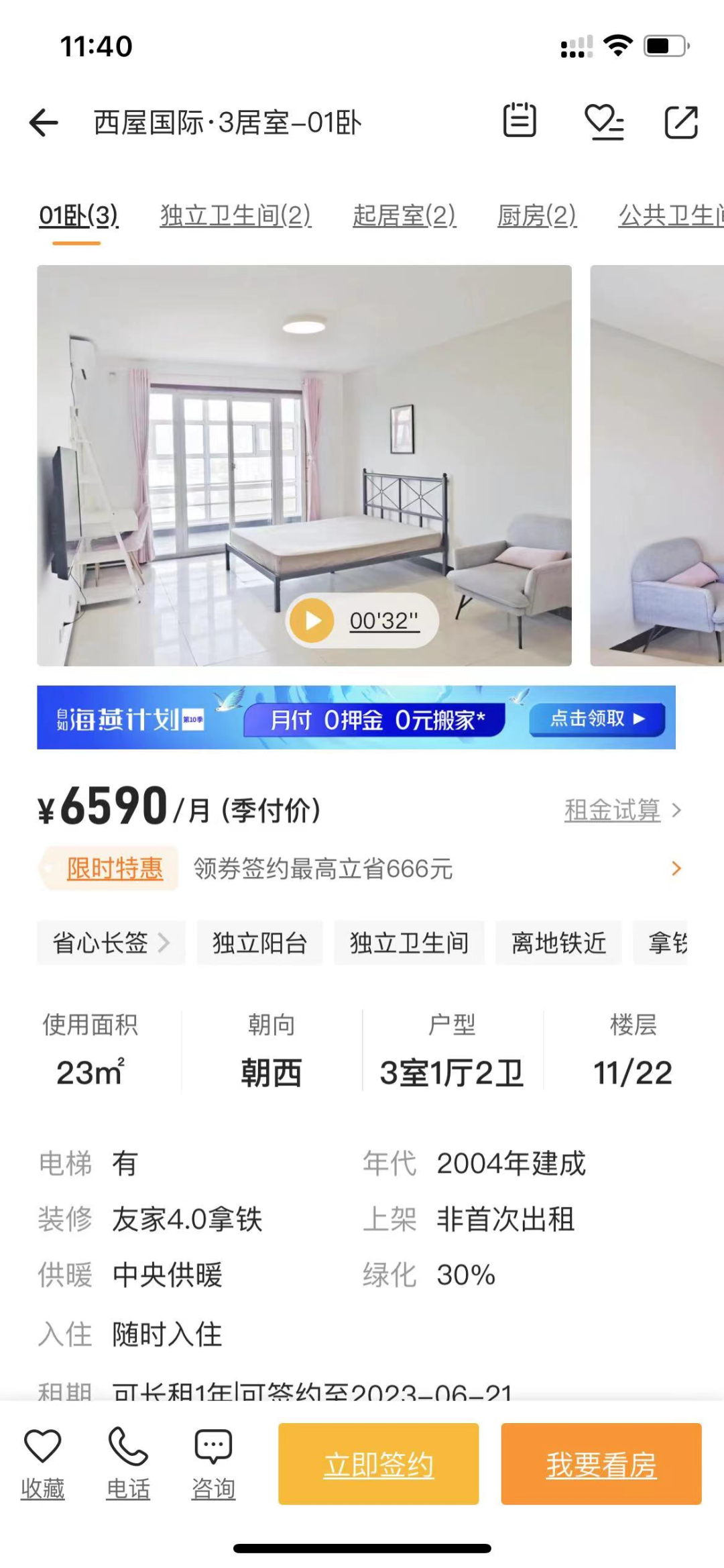 以蘇州街西屋國際的一套房源為例,租金每個月6590元,三家合租,使用面積23平米,帶獨立陽臺和衞生間,朝向為西。可以看出,地理位置和獨立衞生間是這套房子的「價值點」。