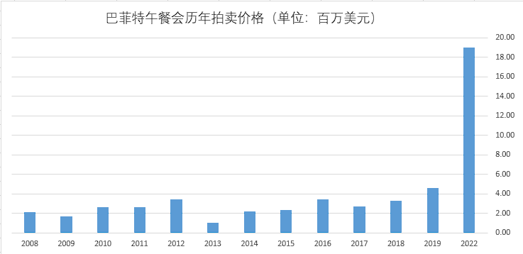 2000年以來,巴菲特已經通過慈善午餐拍賣活動籌集了超過5300萬美元的善款,全部捐給格萊德基金會以幫助低收入者和無家可歸者。雖然起拍價一直是維持在2.5萬美元,但自2008年以來,每個中標者的出價都超過了100萬美元。