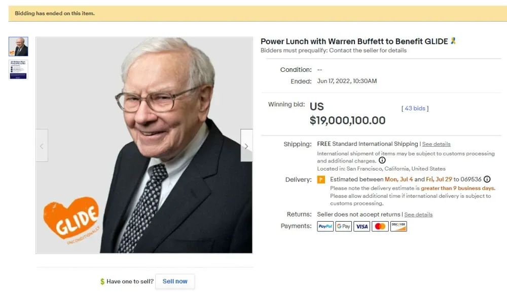 此前,北京時間6月13日7時30分,因疫情中斷兩年的巴菲特慈善午餐在ebay重啟拍賣活動,起拍價為2.5萬美元(約合人民幣16萬元)。今年的中標者最多可攜帶7人與巴菲特在紐約Smith&Wollensky牛排餐廳共進午餐。午餐會上可以討論各種問題,但唯一不能談論的話題是巴菲特接下來可能會買什麼。