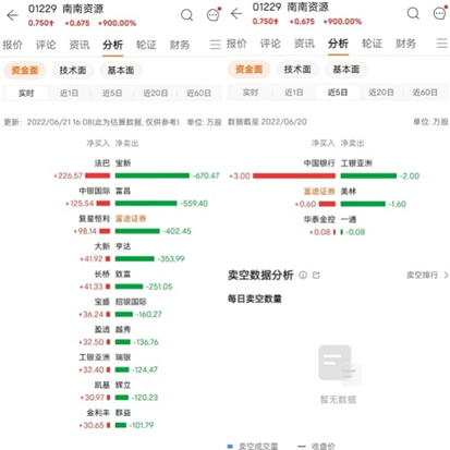 財聯社6月21日訊(記者 成孟琦)今日,預計年度扭虧為盈的南南資源熱度引爆港股市場,盤中一度暴漲超1600%,但自高點又近乎腰斬,最終收漲900%。成交額4.41億,換手率83.45%。股民直呼「奇觀」「刺激,太絕了」,還有股民表示此情景仿若90年代爆款港劇《大時代》重現。探究如此暴漲原因,除昨夜南南資源發佈盈利預警,實現扭虧為盈外,資金的湧入更是其中關鍵。