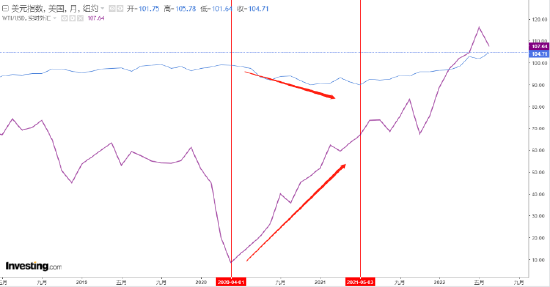 美元指數與油價走勢 來源:英為財情