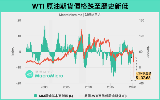 時鍾撥回至2020年4月20日,即將於21日到期的紐約商品交易所5月交貨的WTI原油期貨價格大跌305.97%,收盤價報-37.63美元,首次出現「負值」。