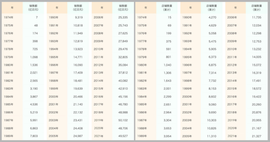 1974年-2021年7-ELEVEN日本市場銷售額及門店數量數據(來源:セブンイレブン)