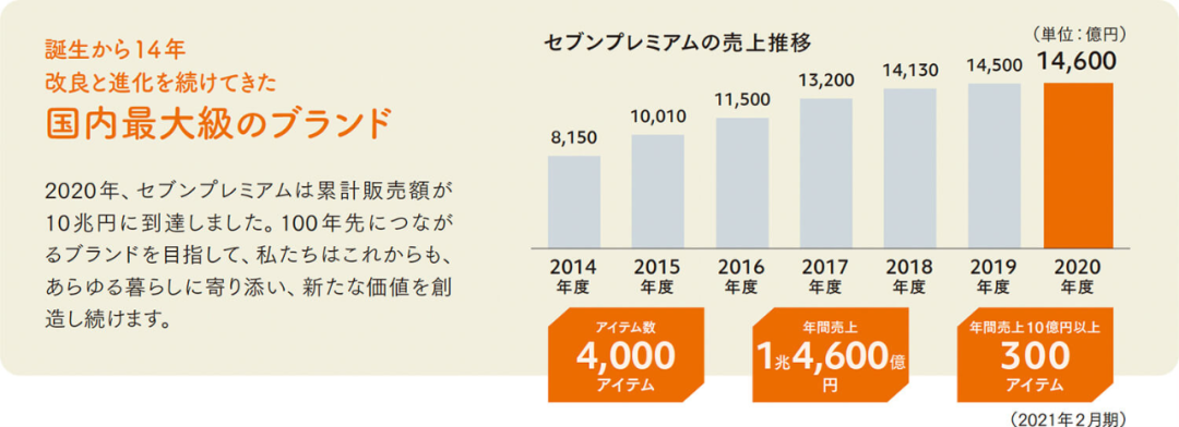 據悉,SEVEN PREMIUM在推出后一年內為7-ELEVEN貢獻了800億日元的銷售額,這一數字在2012年已經增至4900億日元。截止2020 年, SEVEN PREMIUM累計營收高達10 萬億日元。