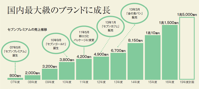 SEVEN PREMIUM推出的「黃金面包」售價250日元,較NB麪包價格高出50%以上,達傳統PB產品價格的兩倍。然而,黃金面包銷量在面市后兩周便突破65萬個,這一數字在4個月后攀升至1500萬個。