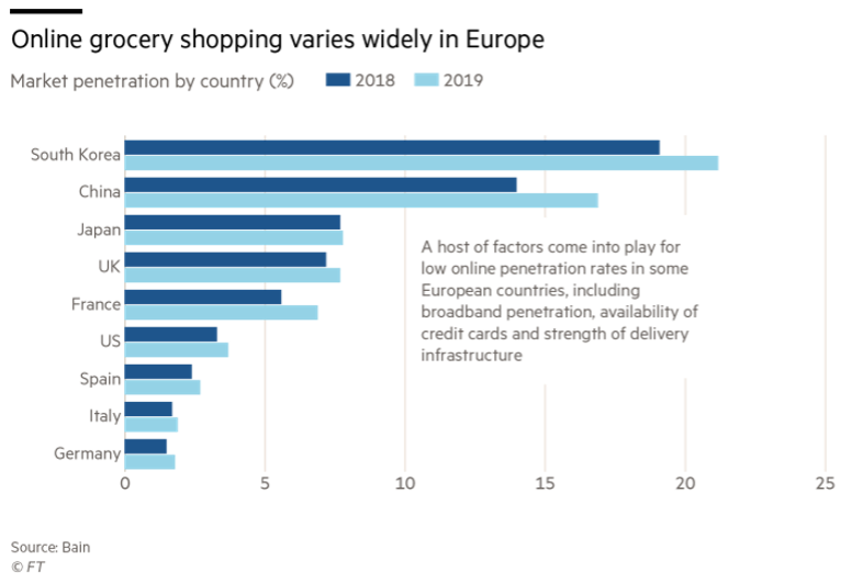 2018/19年各國雜貨零售電商滲透率比較(來源:Financial Times)
