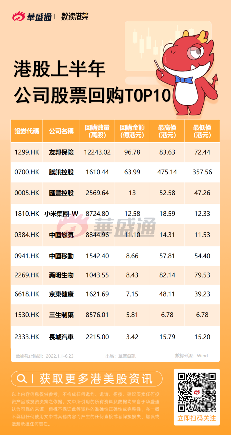 2、港股上半年公司股票回購TOP10