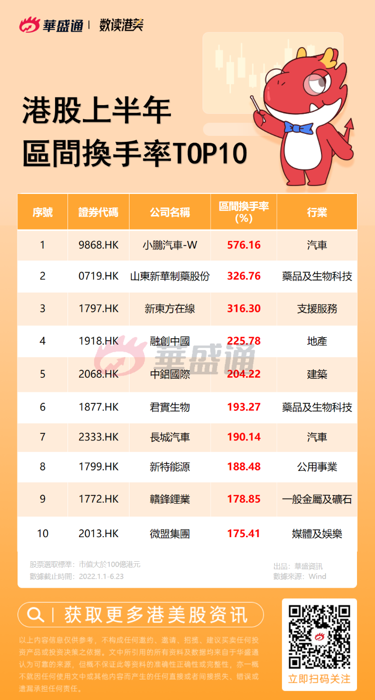 3、上半年港股區間換手率TOP10
